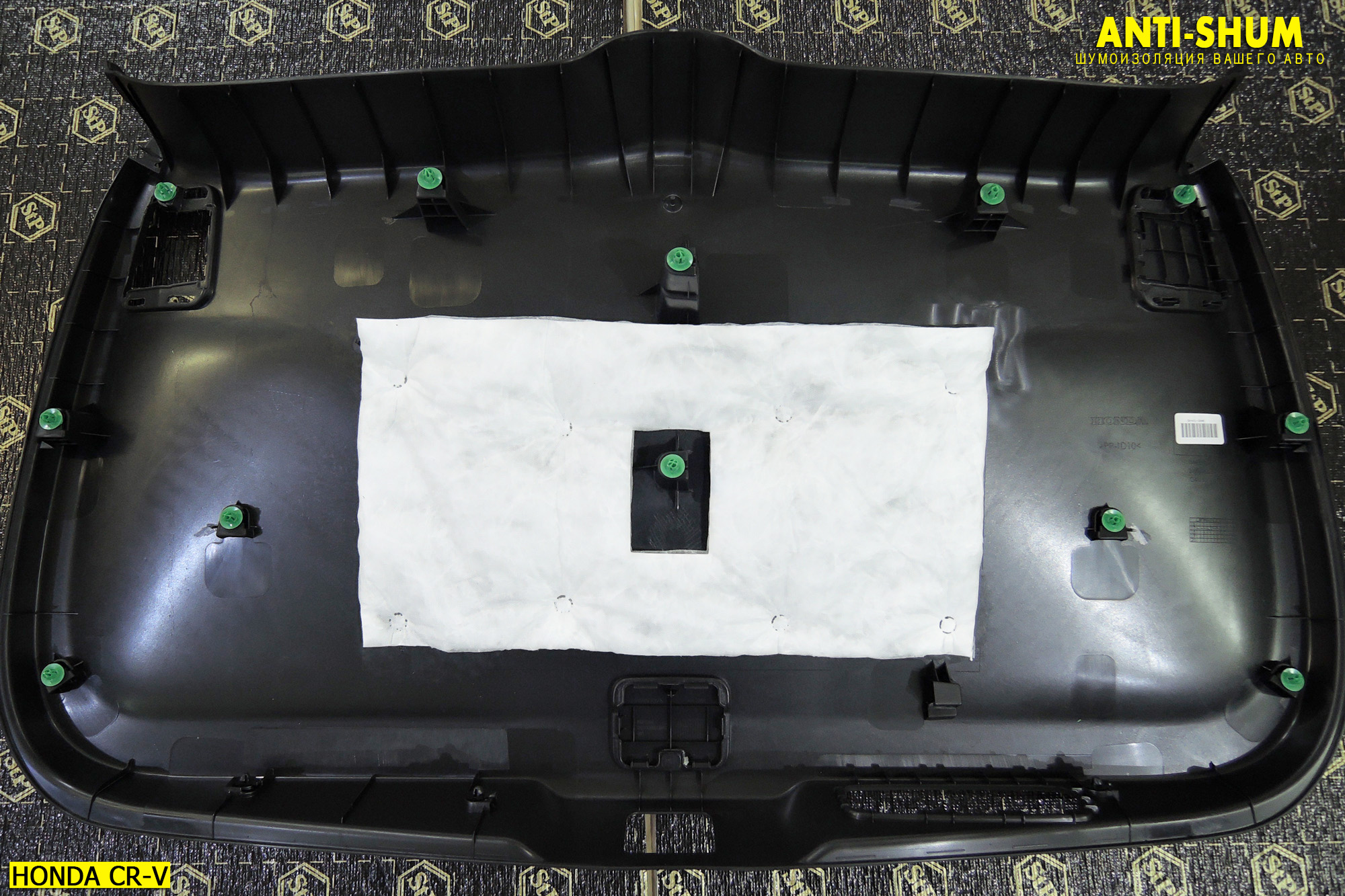 После нанесения двух слоев материала крыша перестала звенеть при простукивании, а значит и при движении автомобиля она не будет вибрировать и создавать низкочастотный гул в салоне Вашей Хонда ЦР-В! Теперь можем собрать верхнюю часть салона и перейти к нижней. Напомним Вам, что все работы с салоном Вашего автомобиля мы проводим крайне аккуратно и только в чистых перчатках, поэтому за чистоту и сохранность элементов салона после шумоизоляции в АНТИ-ШУМ Вы можете не переживать!