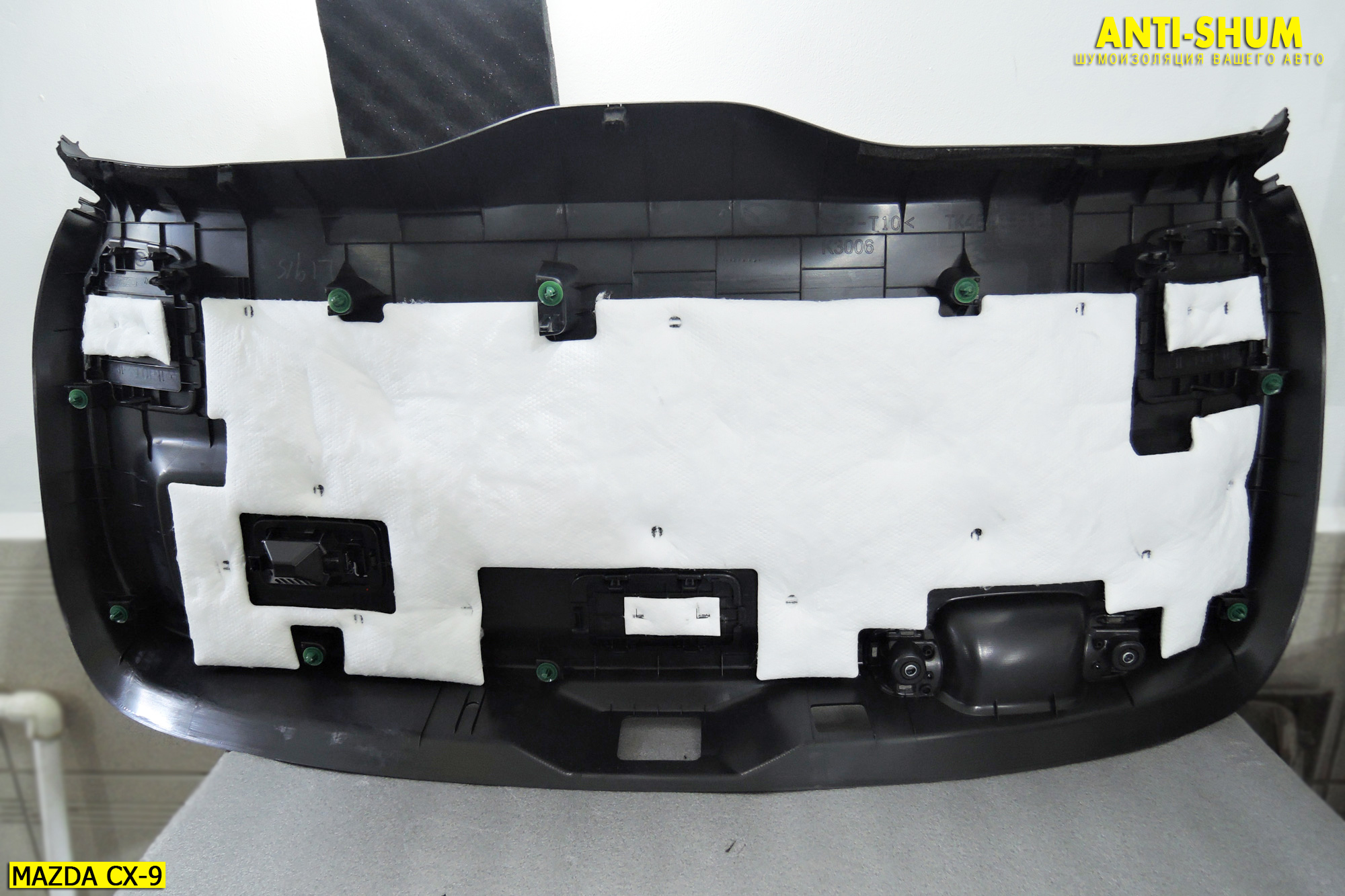 После нанесения двух полноценных слоев на крышу мы можем перейти к сборке верхней части салона. Аккуратно, работая только в чистых перчатках, мы устанавливаем на свои места обшивку потолка, солнцезащитные козырьки, плафоны освещения и пластиковые элементы отделки салона. После этого мы можем переходить к шумоизоляции нижней части салона — днища и багажника Мазды СХ9.
